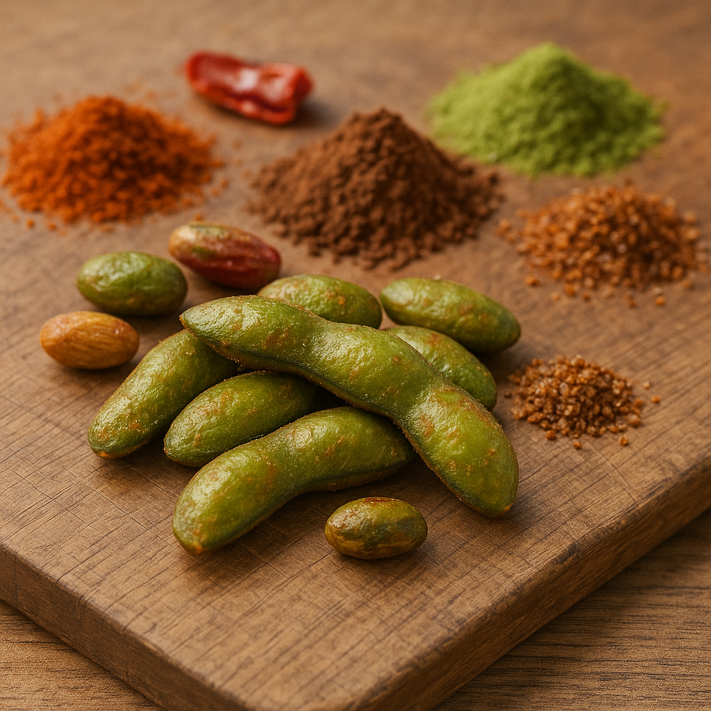 Damit aus den gerösteten Edamame ein einzigartiger Snack wird, verfeinern wir sie anschließend mit sorgfältig ausgewählten Gewürzen. So entsteht jede Sorte mit ihrem ganz eigenen Geschmack – von fruchtig-scharf bis erfrischend-säuerlich.